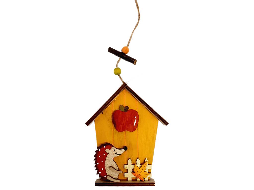 Domeček s ježkem dřevěný závěsný 13 cm žlutý