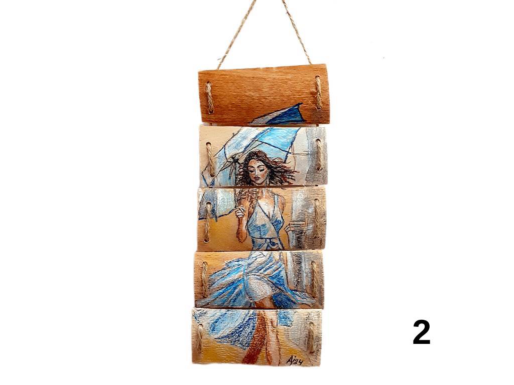 Ručně malovaný obrázek z kousků dýhy spojených provázkem je vhodným doplňkem na stěnu v klasickém i moderním interiéru. Každý kousek je originál.  Materiál: dýha Velikost: výška 23 cm, šířka 10 cm celý popis